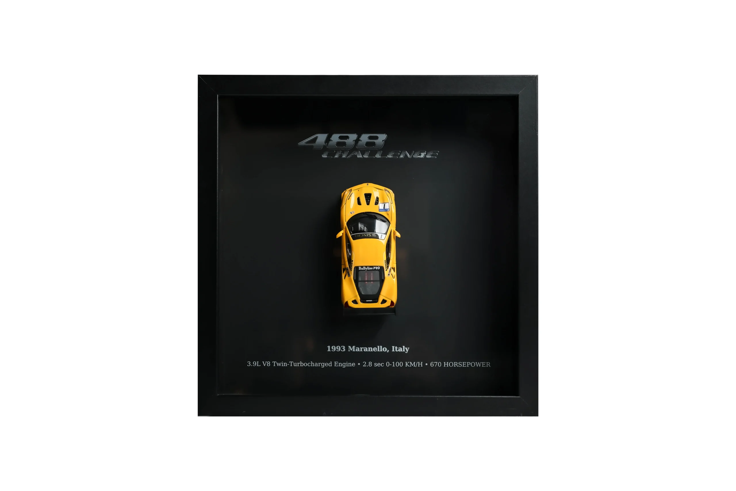 Featuring a bright yellow Ferrari 488 Challenge miniature, this framed collectible brings motorsport energy to any room. A standout for bold display setups.